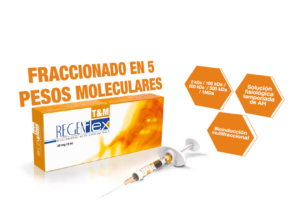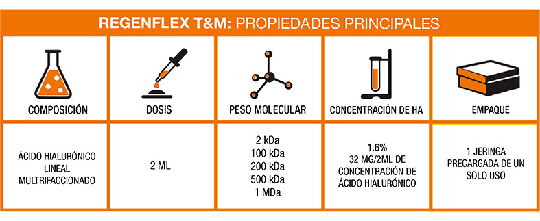 Regenflex T&M es una solución fisiológica tamponada que contiene el 1.6 % de ácido hialurónico multifraccionado con notables propiedades viscoelásticas. El hialuronato de sodio es un componente fundamental del líquido sinovial, ya que es el responsable de sus propiedades viscoelásticas particulares.